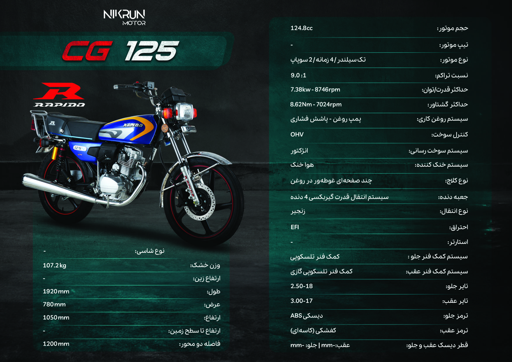 دستهبندی: هوندا 125 سی سیحجم انجین: 125ccسیستم ترمز جلو: دیسکیسیستم ترمز عقب: کاسه ایسیستم خنک کننده: هواخنکصفحه نمایشگر : دیجیتالنمایش بیشتر